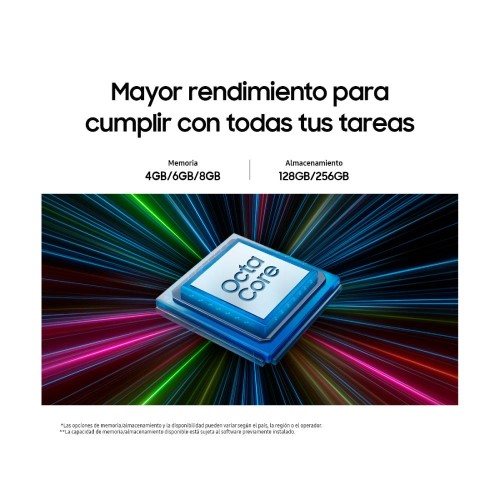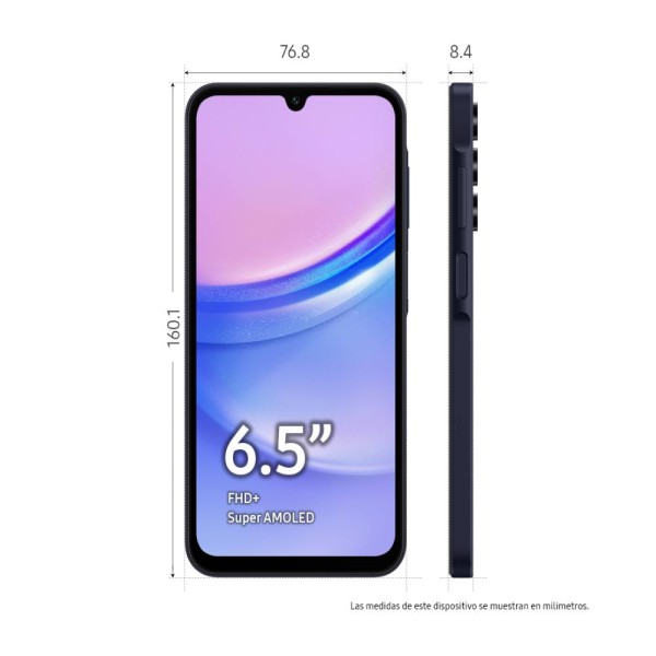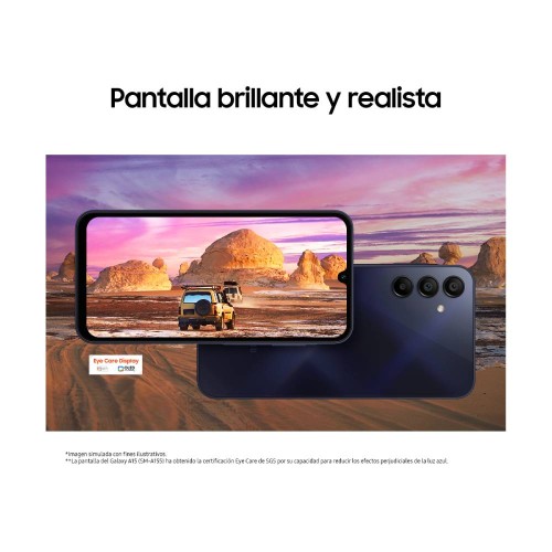 La Serie A de Samsung Galaxy vuelve a sorprendernos con un dispositivo diseñado para ofrecer horas de entretenimiento con la mejor calidad de imagen y la potencia, velocidad y fluidez propias de un ordenador de sobremesa. El nuevo Galaxy A15 cuenta con una pantalla Super AMOLED de 6,5” y 60-90 Hz de tasa de refresco, por lo que vivirás una experiencia única cada vez que veas tus películas y series favoritas. Además, ahora podrás hacerlo donde y cuando quieras, ya que con la tecnología Vision Booster incorporada, podrás ajustar el brillo de la pantalla para que los rayos del sol no te impidan disfrutar del contenido multimedia en el exterior y a plena luz del día. Por otra parte, la emisión de luz azul se ha reducido con las funciones de Eye Comfort Shield, por lo que tu vista estará siempre bien protegida. Al diseño refinado del dispositivo, que cuenta con una cubierta trasera brillante, hay que añadir un rendimiento sobresaliente, gracias al avanzado procesador Octa-Core que te permite ejecutar aplicaciones y realizar tareas a gran velocidad y sin limitaciones. Si hablamos de la capacidad de almacenamiento, Galaxy A15 dispone de 4 GB de memoria RAM y 128 GB de memoria interna para que puedas conservar tus fotos, tus vídeos y aquellos archivos más importantes. De hecho, hasta puedes ampliar la capacidad con una tarjeta MicroSD de 1 TB. En cuanto a la autonomía, con la batería de larga duración de 5.000 mAh podrás jugar a tus videojuegos preferidos y ver contenido en streaming con la máxima calidad durante mucho tiempo sin tener que preocuparte por usar el cargador. Para finalizar, el sistema de cámaras de alta resolución de Galaxy A15 merece una mención especial, ya que el smartphone ofrece una amplia variedad de opciones para que puedas inmortalizar tus recuerdos con todo lujo de detalles. El sensor principal de 50 MP con estabilizador óptico de imagen (OIS) garantiza que tus fotos y tus vídeos se vean siempre con claridad y estabilidad.