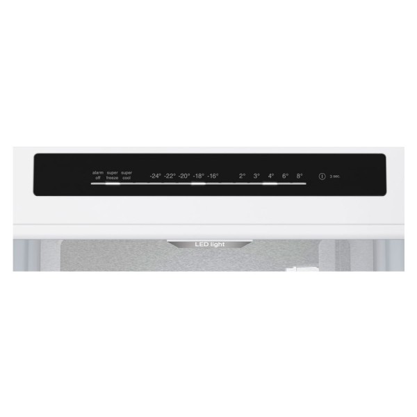 El frigorífico Balay 3KFC869BI luce un acabado en cristal blanco, que facilita su limpieza y mantiene una apariencia impecable gracias a su superficie uniforme. Sus tiradores integrados realzan su diseño moderno y facilitan la apertura. Cuenta con cinco bandejas, tres de ellas ajustables, cuatro son de cristal de seguridad y una rejilla para botellas.