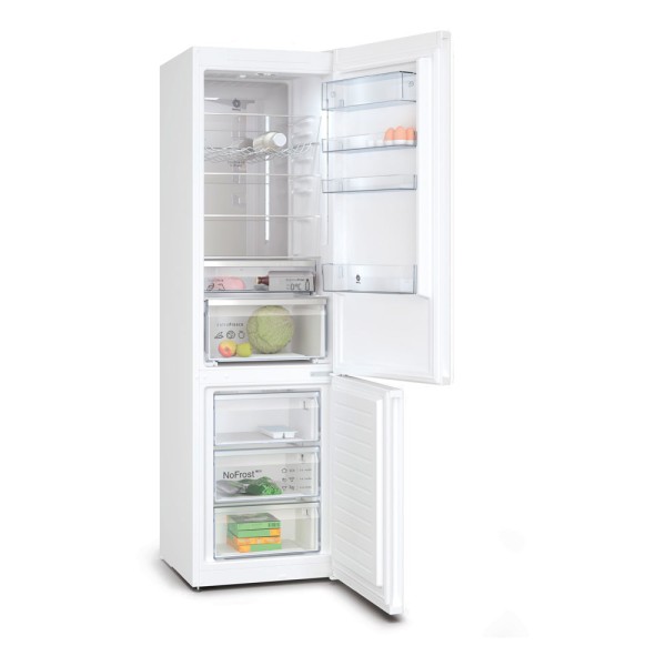 Este modelo destaca por su acabado en blanco que facilita la limpieza y mantiene un aspecto impecable. Los tiradores integrados mejoran la apertura de la puerta. Incluye 5 bandejas, tres de ellas ajustables, un cajón Fresh para frutas y verduras y un cajón ExtraCold para carnes y pescados, junto con tres estantes en la puerta. El congelador cuenta con tres cajones amplios.