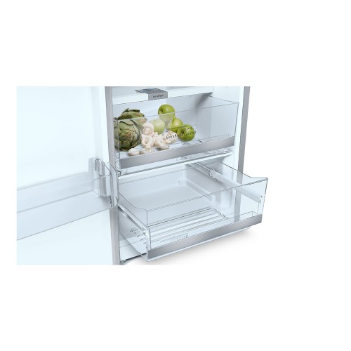 Este modelo luce un acabado en acero inoxidable antihuellas y un tirador externo ergonómico. El cajón ExtraFresh ayuda a mantener organizados y frescos tus alimentos, especialmente frutas y verduras. Las bandejas deslizables y ajustables, junto con un botellero cromado, facilitan la organización. Además, cuenta con un panel de mando interno para ajustar funciones y monitorear el estado del frigorífico.