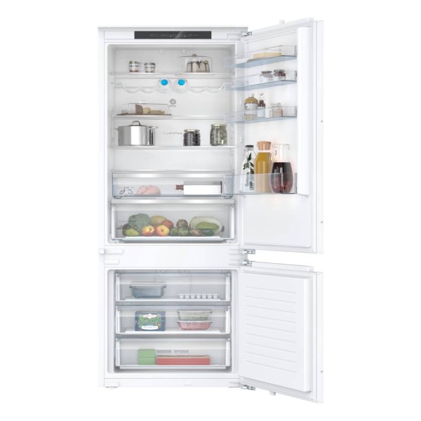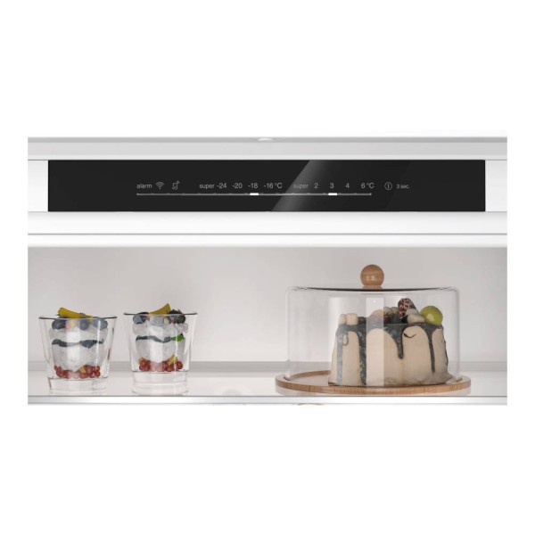 Este frigorífico, con su diseño integrable, se funde con el estilo de tu cocina, pasando casi inadvertido. En su interior, encontrarás un cajón ExtraFresh para conservar frutas y verduras en condiciones óptimas, y otro ExtraCold, ideal para mantener bebidas, carnes y pescados a la temperatura perfecta. Sus bandejas de cristal de seguridad son ajustables y extraíbles, y el soporte de acero para botellas añade un toque de elegancia y funcionalidad.