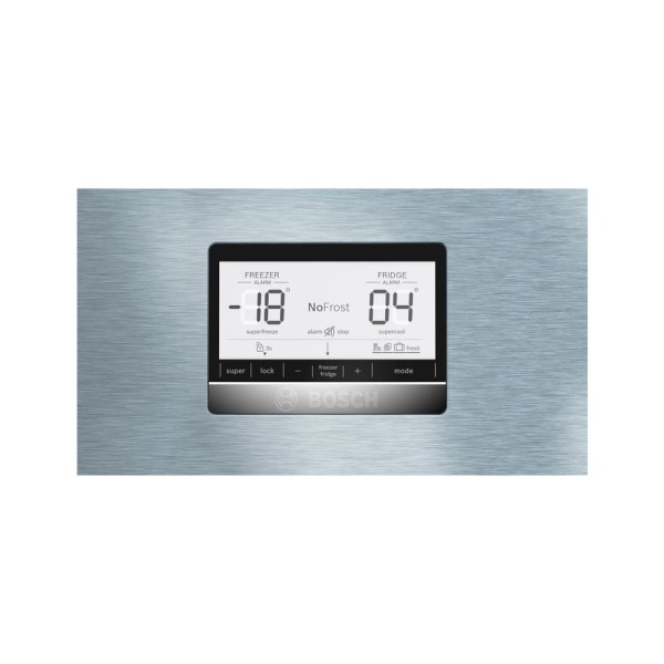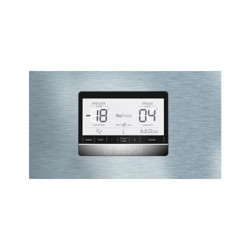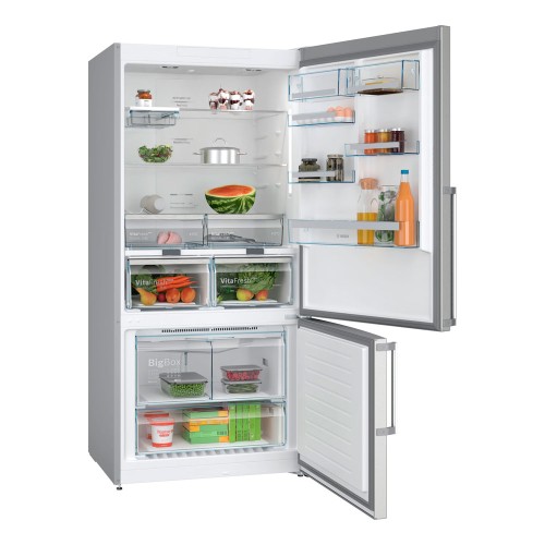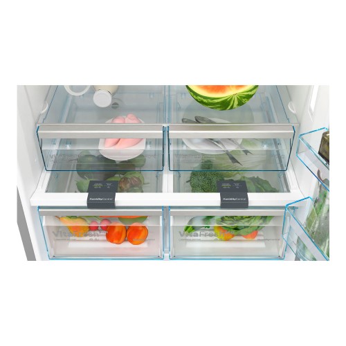Tiene un acabado en acero inoxidable antihuellas con tiradores de aluminio exteriores y cuenta con 5 bandejas de cristal, 2 de ellas ajustables. La puerta ofrece 4 estantes y 4 cajones VitaFresh para frutas y verduras. En el congelador, tiene una autonomía de 17 horas en caso de desconexión y 2 cajones, incluido el espacioso Cajón BigBox.