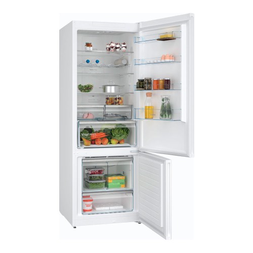 El diseño en color blanco con tirador vertical integrado aporta elegancia a tu cocina. En el interior, el frigorífico cuenta con 4 estantes de cristal, 3 de ellos ajustables, y una puerta con 4 estantes. Los dos cajones 0º C son ideales para carne y pescado, mientras que el cajón VitaFresh mantiene tus frutas y verduras frescas por más tiempo. En el congelador, encontrarás 2 cajones, uno de ellos BigBox de gran capacidad.