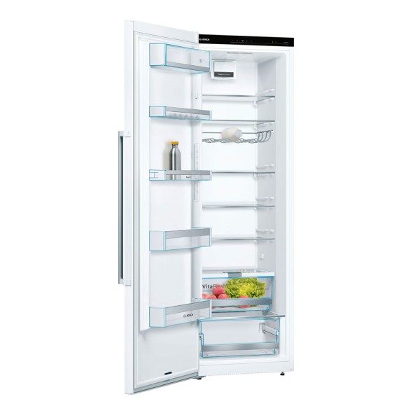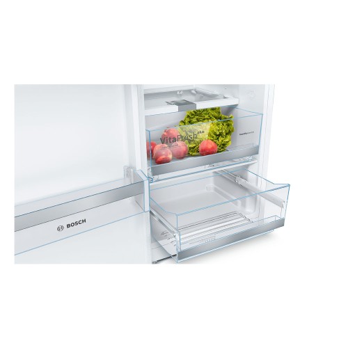 La tecnología del frigorífico Bosch KSV36AWEP Serie 6 incluye bandejas EasyAccess, extraíbles e irrompibles, junto con los cajones VitaFresh, crean un entorno ideal para la conservación de alimentos frescos durante más tiempo, ajustando la humedad y la temperatura interna, mejorando su conservación y frescura.