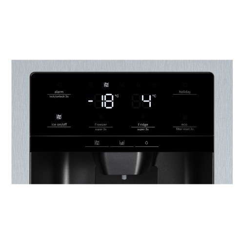 El acabado en acero inoxidable antihuellas reduce la visibilidad de las marcas de dedos, facilitando la limpieza y mantenimiento del electrodoméstico. Los tiradores exteriores verticales y el display digital, ubicado convenientemente en la puerta junto al dispensador de agua y de hielo, mejoran la usabilidad y accesibilidad.