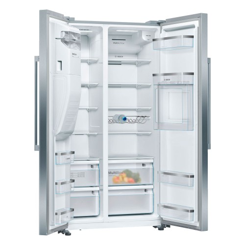 El frigorífico americano Bosch KAG93AIEP Serie 6 presenta un diseño innovador con dos puertas laterales que separan la nevera del congelador para una mejor organización de los alimentos.