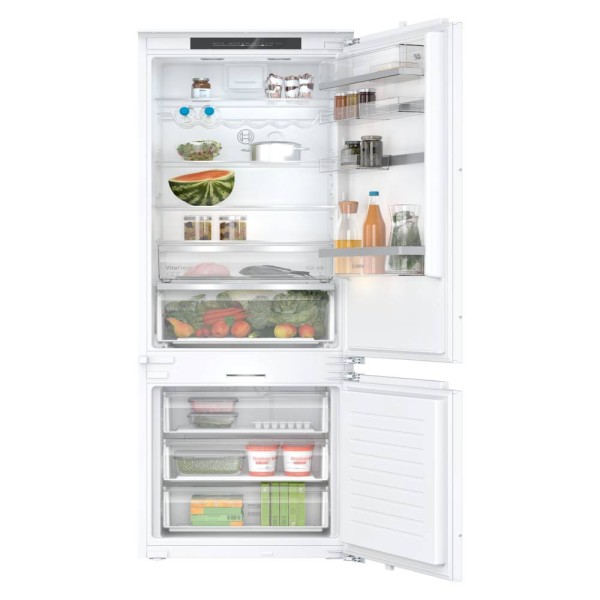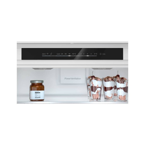 El frigorífico integrable Bosch KBN96ADD0 Serie 4 se distingue por sus generosas dimensiones y capacidad, ofreciendo 381 litros totales, con 284 litros en la nevera y 98 litros en el congelador.
