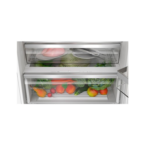 El espacioso sistema VitaFresh XXL 0 °C ofrece el entorno de almacenamiento ideal para los alimentos frescos. Mantiene una temperatura más baja para las carnes y pescados, y un cajón con mayor nivel de humedad que conserva las frutas y verduras perfectamente frescas.