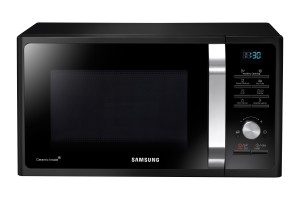 Dale un toque moderno y elegante a tu cocina con el nuevo horno microondas F300G de Samsung, gracias a su frontal negro acristalado con tirador Crystal Touch, el display en azul y su dial en color gris.