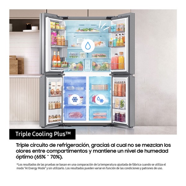 Triple circuito de refrigeración, gracias al cual no se mezclan los olores entre compartimentos y mantiene un nivel de humedad óptimo (65% ~ 70%).