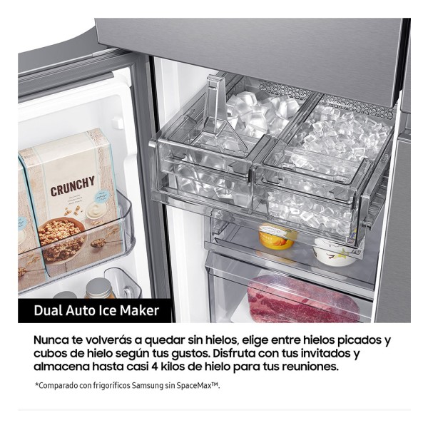 Prepárate para cualquier ocasión con dos tipos de hielo. Dual Auto Ice Maker prepara tanto cubitos de hielo como Ice Bites™, un nuevo formato que enfría las bebidas muy rápidamente. Puede fabricar hasta 2,3 kg de hielo al día y almacenar hasta 4,1 kg*. Y, como está en el congelador, no te quita espacio del frigorífico.
