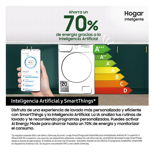 Disfruta un secado más rápido y preciso* a la vez que reduces el consumo de energía en un 10%** y un 15% en tiempo***. La Inteligencia Artificial utiliza sensores para monitorizar el peso y la humedad de la ropa en tiempo real y genera de forma inteligente la cantidad óptima de calor para adaptarla a cada carga.