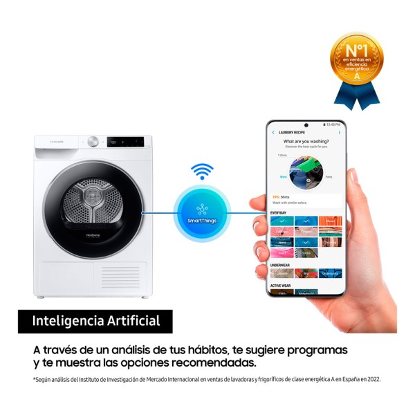 Seca la ropa de manera más fácil y efectiva. La nueva función de las secadoras Samsung recuerda tus hábitos de secado y te sugiere programas en función a tu colada. A través de la app SmartThingsTM* recibirás consejos sobre programas y soluciones de problemas. Y además, con Auto Cycle Link, te recomendará el programa de secado perfecto para la colada que acabas de lavar**.