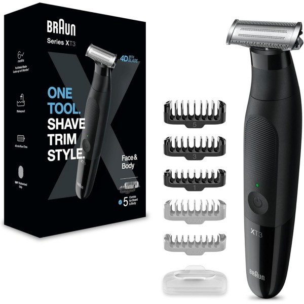Una herramienta. Recorta. Perfila. Afeita. Recortadora de barba, afeitadora para cuerpo y perfiladora para hombre. Para la cara con peines de 1, 3 y 5 mm