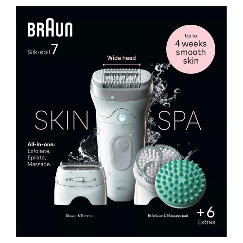 Kit SkinSpa todo en uno para disfrutar de suavidad de pies a cabeza: incluye almohadilla de masaje, cepillo de exfoliación, cabezal de rasuradora femenina y peine de recorte