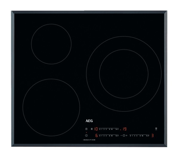 Placa de inducción biselada de la Serie 3000 Induction de 60 cm, zona doble de 28 cm y 5,2 kW, 3 zonas: 28 cm, 21 cm y 14,5 cm, controles táctiles deslizantes (0 - 14 con 3 zonas PowerBoost) individuales con temporizador individual, función Pausa, bloqueo de seguridad, función Hob2Hood