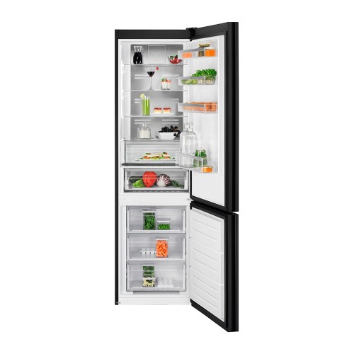 Frigorífico Combi Serie 8000 Cooling 360° de 201 cm x 60 cm, Twintech No Frost con Metal Multiflow, display digital LED en el interior, cajón ExtraChill, luces LED, tirador integrado, puerta plana Cristal Negro.