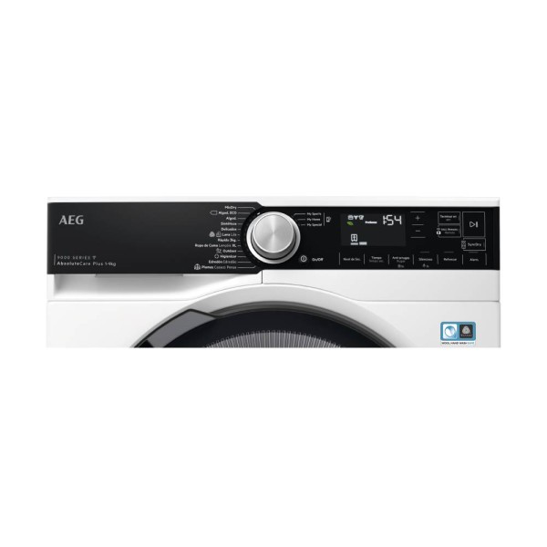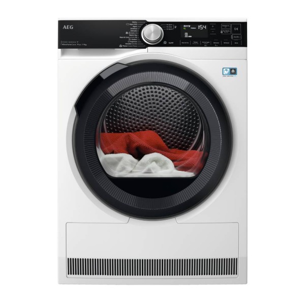 Secadora conectada AEG de 9 Kg con Bomba de Calor de la Serie 9000 con motor Inverter, filtro OkoFlow, Certificado Woolmark Blue, Display LCD XL, panel negro y puerta negra, sistema FiberPro con tecnología 3DScan que detecta la humedad de las prendas, AbsoluteCare que adapta el secado a cada tipo de tejido, tecnología SensiDry que ofrece un secado suave y eficiente y tecnología ProSense que ahorra tiempo y energía.