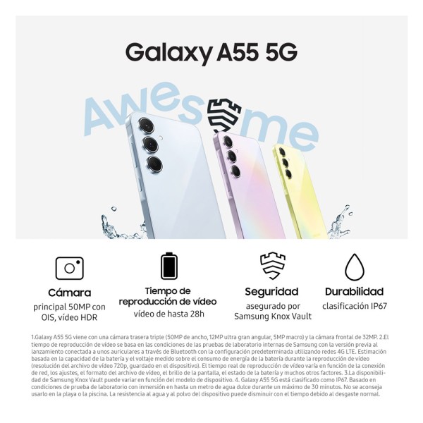 Te presentamos el nuevo Galaxy A55 5G. Mejoramos la sencillez característica de la Serie A de Galaxy con un diseño icónico que incluye un módulo de 3 cámaras y un marco metálico plano que facilita el agarre y lo hace más natural. Cuenta, además, con cristal Corning® Gorilla® Glass Victus®+, que lo hace más resistente y duradero.
