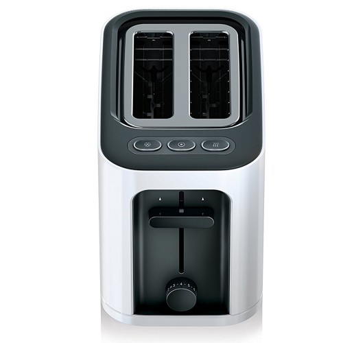 Las funciones de recalentar, parar y descongelar se encuentran en la parte superior. Los controles para elevar y regular el tueste están en el lateral.
