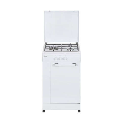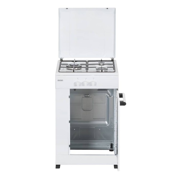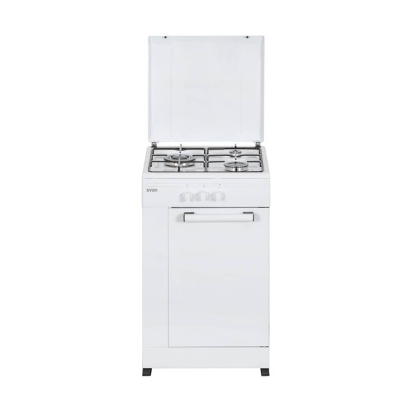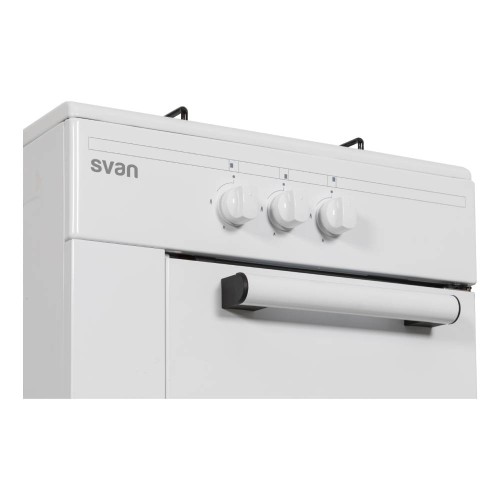 SVAN SKG3500PB. Tipo de producto: Cocina independiente, Color del producto: Blanco, Tipo de control: Giratorio. Tipo de quemador: Encimera de gas, Número de zonas de cocción: 3 zona(s), Tipo de superficie superior: Esmaltado. Carga conectada (gas): 7350 W. Ancho: 498 mm, Profundidad: 515 mm, Altura: 860 mm. Ancho del paquete: 549 mm, Profundidad del paquete: 600 mm, Altura del paquete: 890 mm