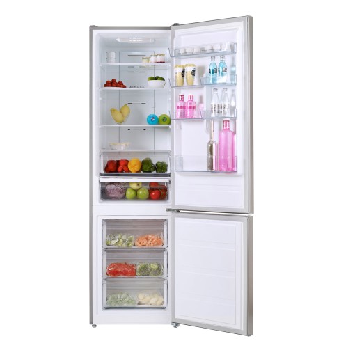 Este modelo luce un acabado en acero inoxidable, lo que facilita su limpieza y aporta un toque moderno a tu cocina. Las puertas con tiradores integrados proporcionan un aspecto visual limpio y elegante. En su interior, cuenta con iluminación LED, bandejas de cristal de seguridad ajustables en altura, dos cajones Fresh Box y un botellero cromado. Además, dispone de balcones ajustables en la puerta y cajones de cristal de seguridad en el congelador. La puerta incluye una pantalla electrónica para un control sencillo de la temperatura y diversas funciones, junto con un sistema antibacterias en la goma de cierre para mayor seguridad alimentaria.