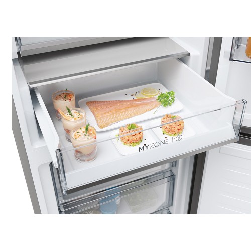 Clase C; 1,85 m x 59,5 cms x 66,7 cms; Capacidad:; 352 L / 235 L Frigo + 117 congelador; Acabado Inox; Total No Frost Lateral; Inverter; Humidity Control System; (Control humedad automático); Cajón My Zone Pro; Luz LED; Super Cooling / Super Freezing; Conectividad WIFI; Botellero plegable.