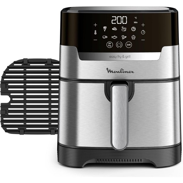 - Freidora de aire 2 en 1, sin aceite, parrilla antiadherente y resistente, ahorro energético, APP Moulinex, 16 funciones, 8 programas, 4,2 L, cocción rápida, tecnología extracrujiente, cocina saludable.