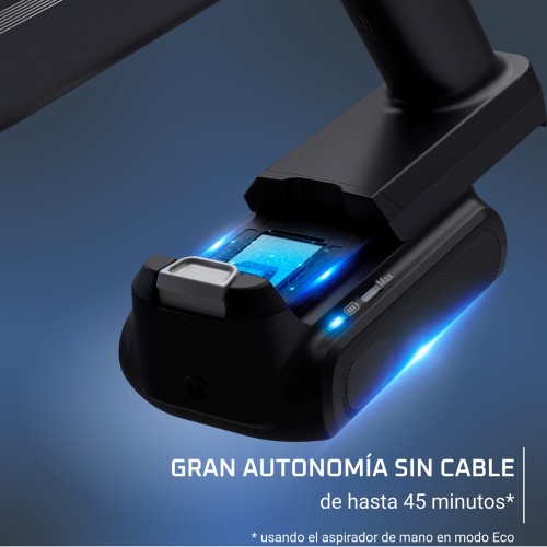 La batería de larga duración ofrece hasta 45 min* de autonomía ininterrumpida para una limpieza completa de todo tu hogar. * Usando la aspiradora de mano en modo Eco.