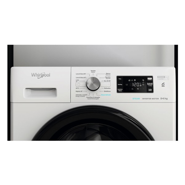 Las características de esta lavasecadora de libre instalación Whirlpool: color blanco. Extraordinaria capacidad de lavado de 8,0kg Gran capacidad de secado de 6,0kg. Exclusiva tecnología 6th SENSE que constantemente monitoriza la humedad en el tambor, protegiendo tu ropa y garantizando perfectos resultados de lavado y secado. Rápida y eficiente velocidad de centrifugado de 1400 revoluciones por minuto.